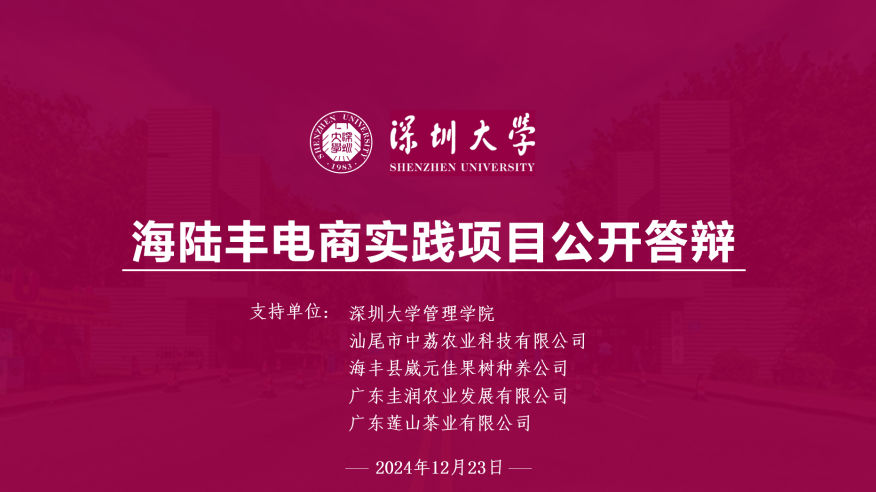 为深入贯彻广东省委、省政府关于“百校联百县助力百县千镇万村高质量发展工程”的工作部署,在党委书记何军的牵头和电子商务系余明珠教授的组织下,深圳大学管理学院于12月23日举办了海陆丰电商实践项目公开答辩活动。党委书记何军、深大双百行动驻陆丰市干部深大后勤保障部副主任邵存才、海丰县崴元佳果树种养公司总经理项明祥、汕尾市中荔农业科技有限公司总经理连国荣、以及相关教师代表和活动负责人作为专家评委参加了本次活动。汕尾市教育局副局长张逸琴、深大发展规划部副主任余丽娟以及其他教师代表、相关活动负责人及汕尾市的干部及企业家作为嘉宾线上参加了本次活动。