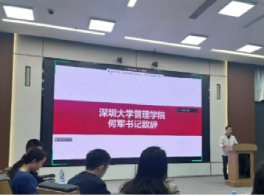 答辩正式开始前,深圳大学管理学院党委书记何军发表了热情洋溢的致辞。他对到场的嘉宾和师生表示热烈欢迎,并对大家的支持和参与表达了由衷的感谢。何军书记表示,此次活动是将课堂学习与社会实践相结合的重要尝试,为同学们提供了一个真实了解地方经济发展的窗口。他鼓励参赛团队以饱满的热情投入展示,积极展现创新能力与实践成果,为乡村振兴贡献智慧力量。他还强调,管理学院高度重视“双百行动”,通过调研与实践,形成了一系列扎实的帮扶方案,推动校地合作走深走实。