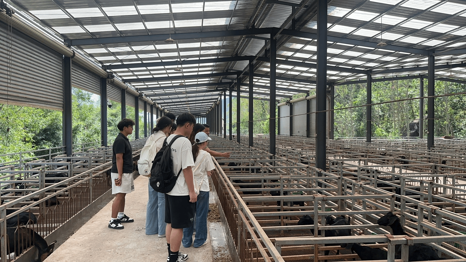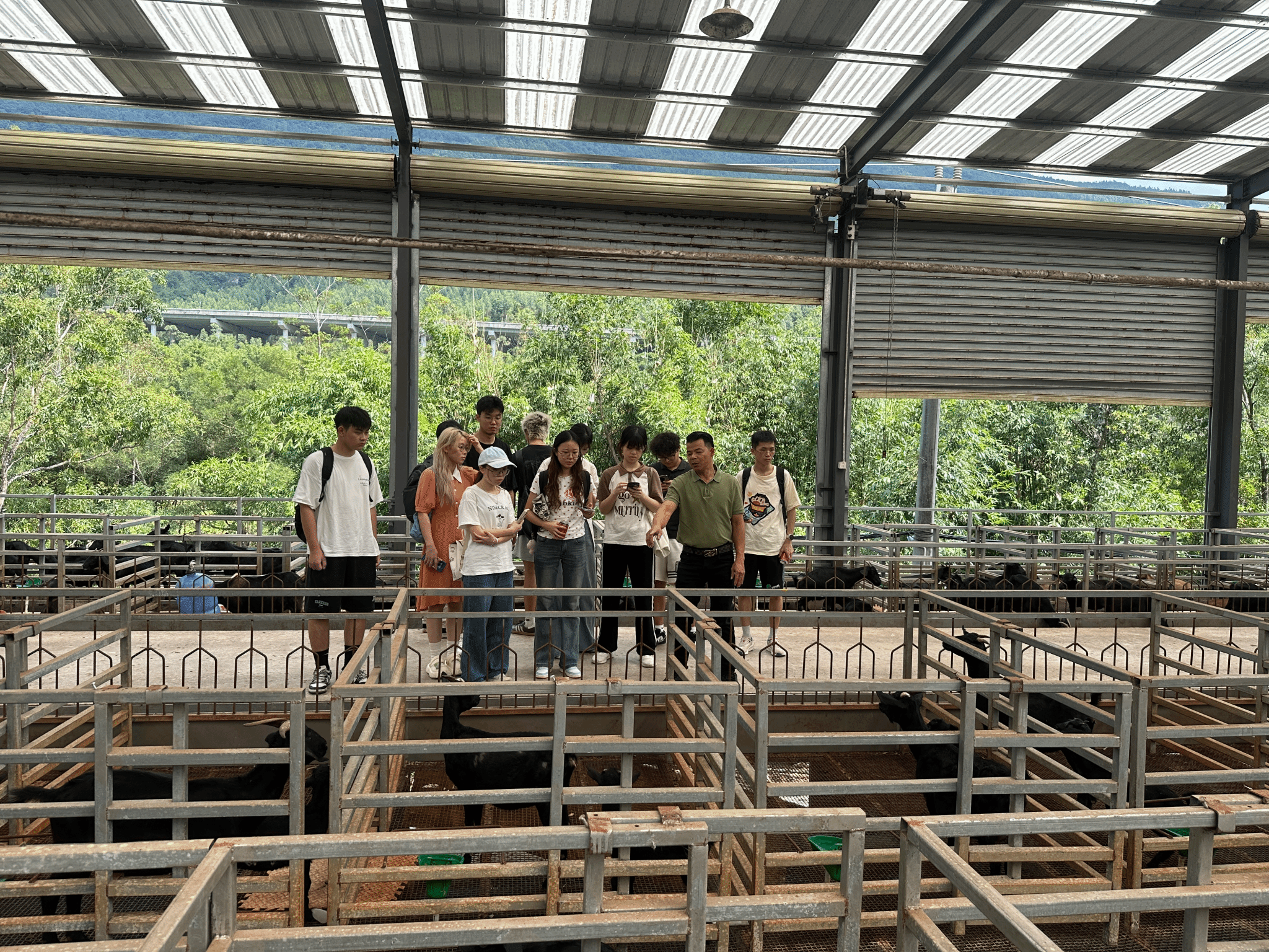 调研过程中,师生团队走访了东山羊养殖基地,负责人彭展雄先生详细介绍了基地黑山羊的品种、生产周期、生态养殖模式以及“集中于线下自营门店销售”的现状。结合基地现状,师生团队与彭展雄先生围绕 “如何打造地域特色羊产品品牌”等问题展开讨论,学生们现场记录数据、梳理需求,并提出“品牌名称研究”“以KOL促销售”、“一体化农家乐”等初步研究方向。