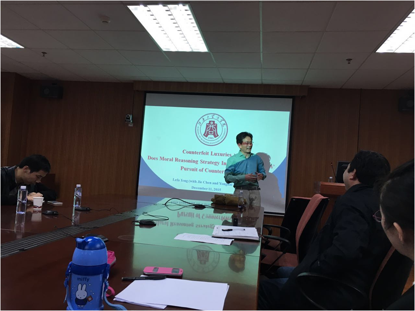 12月11日下午2:30,江南大学商学院院长滕乐法教授莅临深圳大学管理学院,就题为“Counterfeit Luxuries: Does Moral Reasoning Strategy Influence Consumers’ Pursuit of Counterfeits?”的论文,分享其写作思路、及与编辑和评阅人互动过程,给学院师生带来了精彩的学术体验。讲座由管理学院副院长周志民教授与市场营销系主任刘世雄教授共同主持,学院部分教师和研究生参加了本次学术活动。