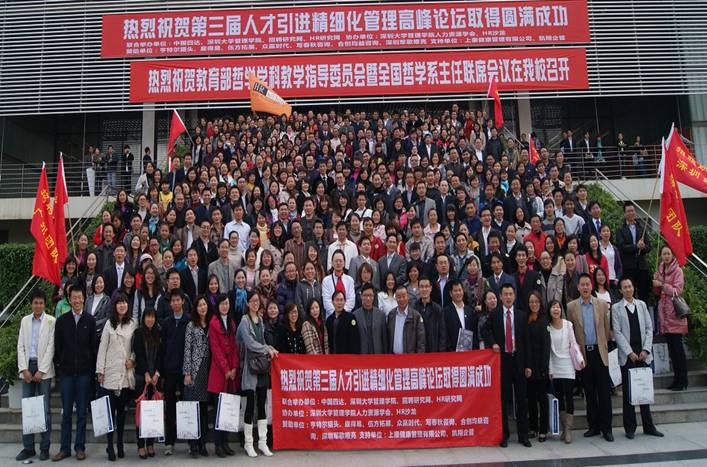 12月19日,由招聘研究网和深圳大学管理学院主办,我校人力资源学会承办的“第三届人才引进精细化管理高峰论坛”在深圳大学隆重召开。本次论坛,旨在秉承“深度剖析现状、聚集实战问题、关注热点难点、寻求解决之道”的理念,以“企业大学人才管理战略与实践”为主题,探讨人力资源管理若干前沿问题。来自珠三角各城市的大中型企业人力资源管理从业人员、企业大学管理人员700余人济济一堂,参加了本次高峰论坛。论坛邀请到原国家人事部副部长、中国人才研究会会长徐颂陶先生,广东省人力资源和社会保障厅副厅长林王平女士、赵伟光先生及国内重量级企业人力资源高管多人,作为本次论坛的主讲嘉宾。与会人员立足企业管理实践案例,展示名企人才培养之道,就为其他企业提供有效的人才培养策略等话题展开整整一天的精彩纷呈的经验交流分享。