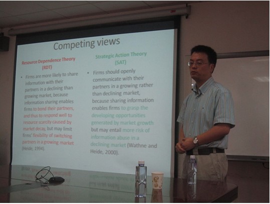 本次讲座的主题有两部分:《市场容量和企业间的信息分享:专有资产的调节作用》和《制度压力、企业能力与在线渠道的使用强度》。首先,寿博士介绍了第一篇文章——该文获得西班牙国际学术会议最佳论文奖。他分享了选择研究主题的方法有二,即解决理论之间的矛盾以及现实之间的矛盾。第一篇文章旨在解决企业之间信息共享机制在RDT理论(Resource Dependence Theory)和SAT理论(Strategic Action Theory)之间的矛盾问题。他在不同的市场容量下,以专有资产为调节变量来分析RDT和SAT理论分别在哪种情况下预测企业信息分享行为更有效。另外,寿博士还为我们简要介绍了其第二篇文章的研究思路,着重介绍了调节效应的实证方法,并且还为现场师生热心答疑,与大家探讨学术研究的心得。市场营销系的多位老师以及部分营销专业研究生和本科生参加了本次活动,并与寿博士积极互动。