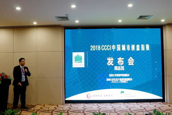 在特别环节中,举行了客座教授聘任仪式,聘任中国科技开发院党委书记、院长杨斌为深圳大学管理学院客座教授。值得关注的是,2018中国城市创意指数(CCCI2018)在活动中发布,该指数是国内首个跨城市对比的文化产业竞争力指数,已连续7年发布。今年的CCCI研究对中国50个大中型城市(含省会城市、港澳台、直辖市、副省级城市及经济较发达的城市)进行了评估。数据显示,各城市文化产业发展稳步增长,而北上港深杭广稳居前六,其中深圳的CCCI增加幅度全国排名第一。但数据也披露出不少问题:我国文化产业发展仍呈现严重的区域发展不均衡,一些城市在文化产业领域的传统劣势依然凸显,例如深圳在城镇居民教育文化娱乐服务消费支出占全部消费的比例上,深圳的排名历年来都很靠后等。指数主研者、深圳大学管理学院副院长周志民教授介绍,50个中国城市创意指数可以从横向和纵向两个角度量化地方政府发展文化产业的工作绩效,为文化产业管理决策提供参考依据。