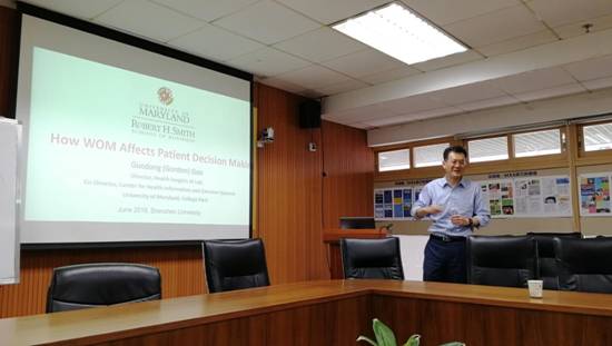 2019年6月28日星期五上午,马里兰大学史密斯商学院高国栋教授做客“深圳大学管理学院管理科学前沿论坛(第97期)”。高国栋,博士,健康洞察人工智能实验室主任,健康信息与决策系统中心联席主任,马里兰大学史密斯商学院教授。他在宾夕法尼亚大学获得博士学位,在清华-麻省理工斯隆管理学院联合项目获得工商管理硕士学位,在清华大学获得学士学位。他的研究兴趣包括医疗保健,健康IT和质量透明度方面的大数据和人工智能。高博士发起并共同组织了健康信息技术与分析年度会议。他的研究得到了国家自然科学基金和美国国家健康研究院的资助。高博士是美国国家科学基金会职业奖的获得者。