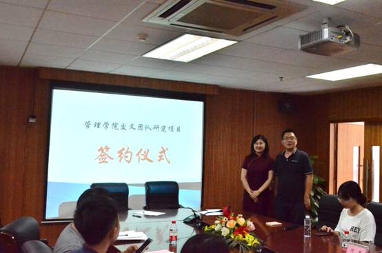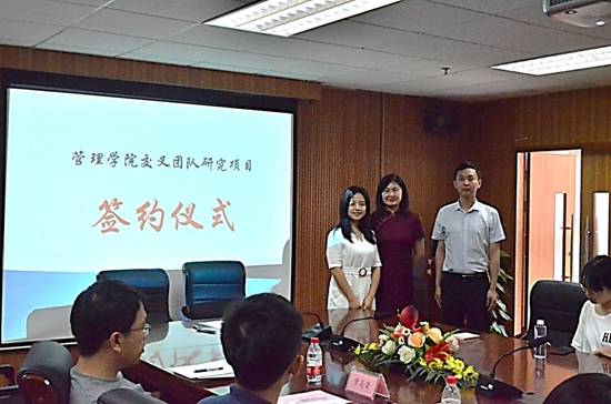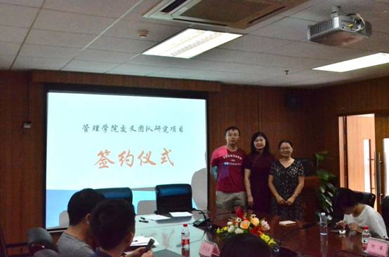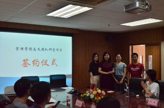 会上首先进行了管理学院交叉学科团队研究项目的签约仪式,该项目受资助对象为我院教师所组建的交叉学科团队,旨在促进我院三大学科(工商管理、管理科学与工程、公共管理)教师积极开展学科间的合作研究,孵化更多高质量的科研成果,提升学院的学术科研氛围和教师科研水平。2019年,我院共对四个交叉学科研究团队项目进行了资助,分别为:丁婉玲老师和杨辰老师的“绩效反馈、管理层过度自信与新兴市场跨国企业国际化速度——基于上市公司公开文档信息语义挖掘的实证分析”项目研究团队;冯元粤和杨翩翩老师的“游戏化众包平台接包方持续参与行为影响因素研究”项目研究团队;范壁老师、吉莉老师和姜令老师的“基于多元高斯过程的意见领袖(KOL)网络营销建模与运营优化研究”项目研究团队;秦全德老师、梁雨晴老师和张蕾老师的“新能源汽车政策协同建模与市场推广研究”项目研究团队。