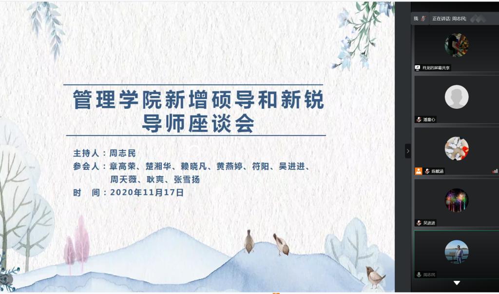 11月18日下午4:00,管理学院组织了新增硕导和新锐导师在线交流恳谈会。9位本年度新增硕导及新锐导师参加了恳谈会。管理学院研究生工作分管领导周志民教授主持了会议。