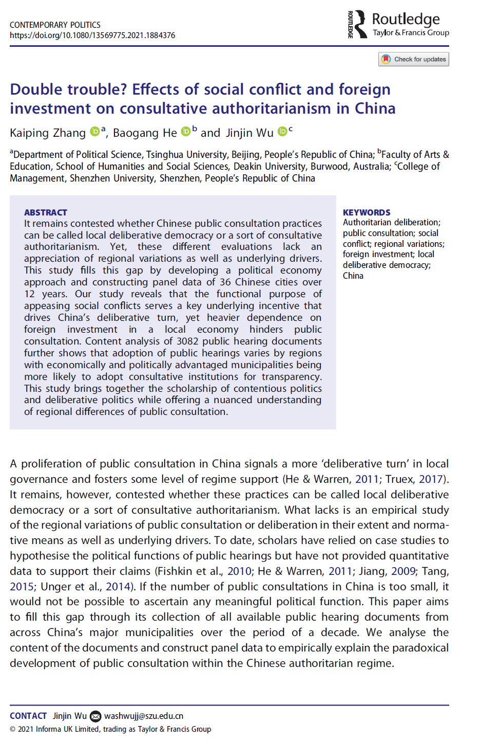 近日,管理学院公共管理系助理教授吴进进博士作为通讯作者的论文“Double trouble? Effects of social conflict and foreign investment on consultative authoritarianism in China”(“双重困境”?社会冲突与外商投资对中国协商民主的影响)在Contemporary Politics 发表。该文与澳大利亚迪肯大学何包钢教授,清华大学政治学系张开平助理教授合作完成。Contemporary Politics是政治学与国际关系研究的国际顶尖期刊,影响因子为1.65。