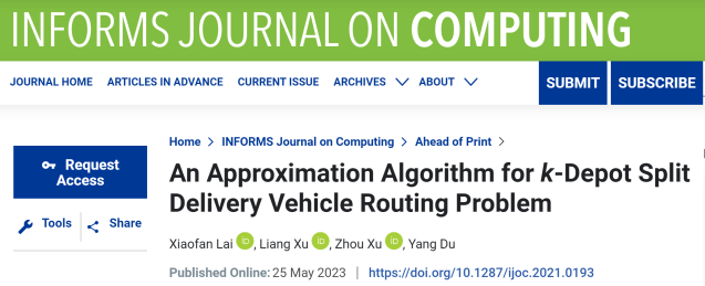 近日,我院管理科学系赖晓凡副教授的学术论文“An Approximation Algorithm for k-Depot Split Delivery Vehicle Routing Problem”被国际顶级期刊 INFORMS Journal on Computing(IJOC)录用并在线发表。该期刊是美国运筹学与管理科学协会(INFORMS)的会刊之一,也是美国德克萨斯大学达拉斯分校(University of Texas, Dallas)选出的用于评估美国商学院前100名研究能力的24本学术期刊(简称UTD24)之一。该研究成果以深圳大学管理学院为第一署名单位,是我院高质量科研成果的重要体现。一直以来,学院及管理科学与工程学科点重视科研发展,鼓励从事前沿科学研究,以高质量产出推进学科的建设。
