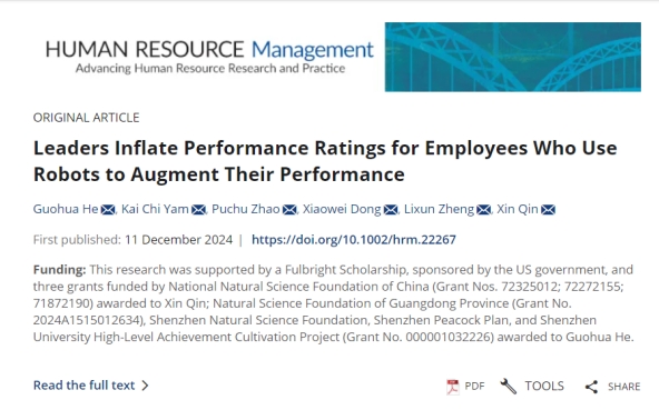 近日,管理学院人力资源管理系助理教授何国华作为第一作者的论文“Leaders Inflate Performance Ratings for Employees Who Use Robots to Augment Their Performance”正式被Human Resource Management期刊JCR-SSCIQ1分区;最新五年影响因子7.0)录用并在线发表。该期刊是人力资源管理领域的国际顶级期刊,也是Financial Times评定的50本商学院顶级期刊之一,2023年录用率仅为3%,在国际上具有很高的认可度。该论文的通讯作者中山大学管理学院秦昕教授,第二作者新加坡国立大学的Kai Chi Yam教授,其余作者包括中山大学管理学院博士生赵璞初、董小炜,以及清华大学经济管理学院博士后郑立勋。