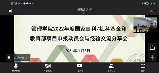 11月3日下午,管理学院组织召开了2022年度国家自科/社科基金和教育部项目申报动员会与经验交流分享会。会议由管理学院科研副院长周志民教授主持,邀请四位我院2021年国家项目资助获得者——张庆宇教授、秦全德副教授、袁靖波博士、周天薇博士作为分享嘉宾。管理学院李丽院长及50余位教师参加了会议。