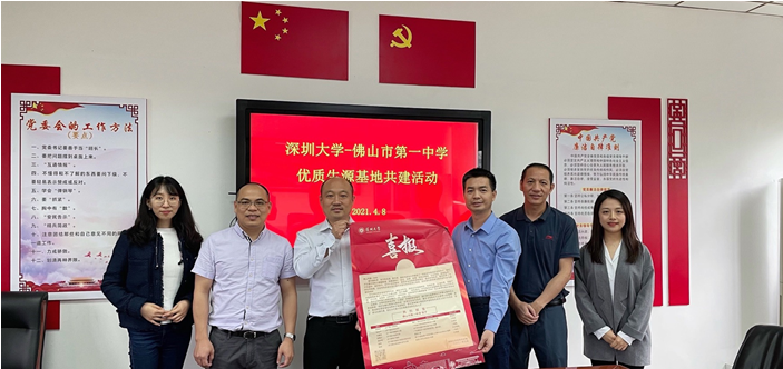 4月8日下午,何军书记、丁婉玲老师、教学秘书宋宜诺走访佛山市第一中学,就学院招生宣传工作与佛山一中副校长何轩、教务主任黄广慧展开了沟通交流,并带去了彰示佛山一中优秀学子在深大取得优异成绩的“喜报”。