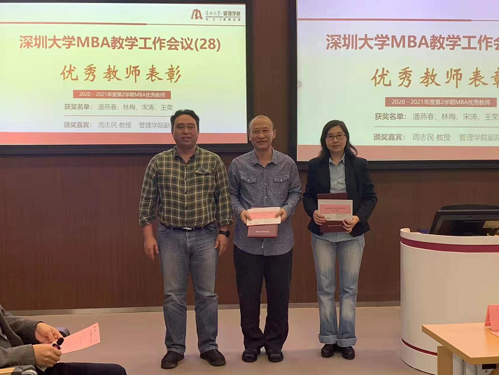 为鼓励任课教师提高教学质量,提升培养质量,MBA教育中心对2020-2021年度第2学期优秀任课教师进行了表彰。管理学院副院长马卫红教授为教学测评班级第二名(韩巍教授、陈莉副教授、张蕾博士)颁奖;管理学院副院长周志民教授为学期MBA优秀教师(潘燕春教授、林梅副教授、王荣博士、宋涛教授)颁发证书。
