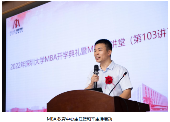 8月27日上午,深圳大学2022级MBA开学典礼在丽湖校区图书馆D101报告厅隆重举行。深圳大学副校长汪永成出席开学典礼并致辞,管理学院党委书记何军、副院长牛奔、深圳大学附属华南医院助理院长樊光辉、教师代表陈星宇以及特约教授悦兴集团CEO邝保英、深圳市龙华区中心医院党委书记王光明、深圳市龙华区人民医院副院长王细生等领导嘉宾参加开学典礼。典礼由深圳大学MBA教育中心主任贺和平主持。