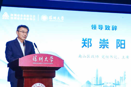 南山区政协党组书记、主席郑崇阳在致辞中指出,深圳企联作为深圳市规模最大,行业覆盖面最广的综合性社会团体,多次荣获全国省市四好行业协会称号,赢得了政府与社会各界的认同,为促进深圳和南山区的经济社会发展都作出了积极的贡献。他指出,深圳具有一流的营商环境,吸引众多企业纷至沓来。目前经营主体已经超过了440万户,上市公司580余家,展现了蓬勃的经济活力。南山作为经济大区,科技强区创新高地,经济总量连续12年居全省区县第一名,2024年GDP达到9,500亿元,正以昂扬之姿向万亿级城区迈进。目前南山区的经营主体超过60万户,上市企业达到了217家,密度居全国区县第一。他强调,当前我国经济增长已从过去的高速度增长逐渐向高质量增长转变,加之逆全球化持续,地缘冲击加剧,经贸摩擦不断,经济社会发展面临诸多的挑战,但越是面临挑战,我们越要大力弘扬企业家精神,增强家国情怀,担负起促进共同富裕的社会责任,营造良好的企业家成长生态,培育更多世界一流企业,为经济发展积蓄力量。