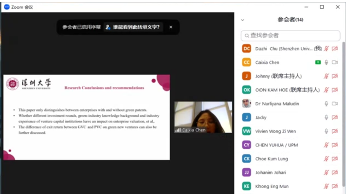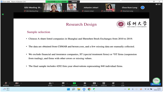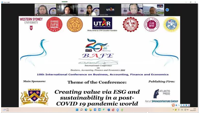 BAFE会议(商务、会计、金融和经济国际会议)是马来西亚拉曼大学主办的经济管理类国际学术年会,深圳大学管理学院作为协办方之一,与马来西亚拉曼大学(Tunku Abdul Rahman University)联合举办第10届BAFE国际会议。本届会议主题为“后疫情世界中创造‘环境、社会和公司治理’的价值和可持续性”。深大师生在2022年10月11日在线参加会议。