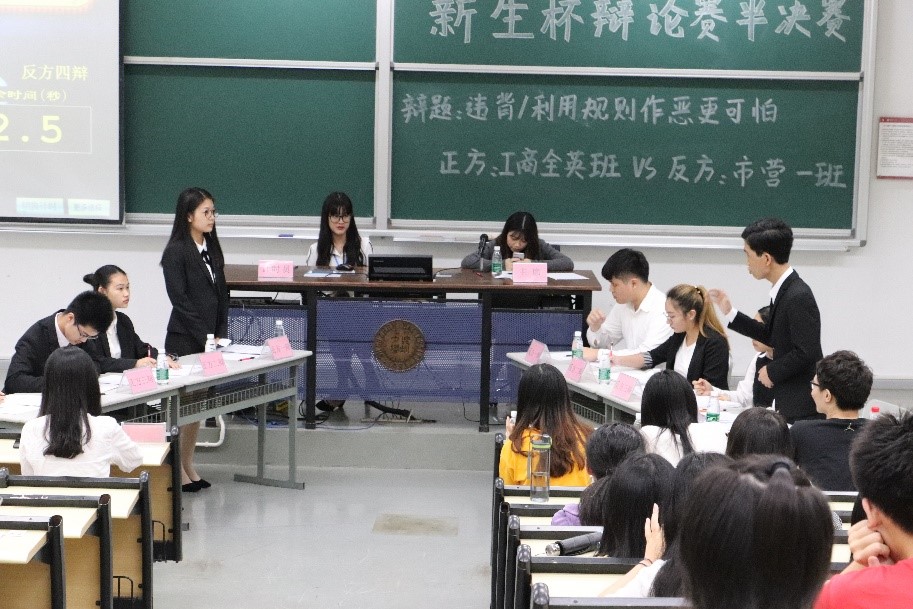 “新生杯”辩论赛半决赛于2018年11月16日晚在文科楼H02举行。电商1班与行管1班就“懂得自欺欺人是人的幸运/不幸”进行交锋;工管全英班与市营1班就“违背规则作恶/利用规则作恶更可怕”各自抒发了观点。