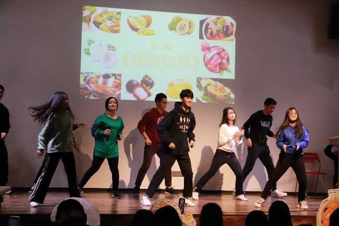 首先是各部门的才艺表演环节。表演节目包括社团部的“深夜电台”、宣传部的“油腻养生争霸赛”、组织部的 “识食物者为俊杰”、学术部的“辣条行者”、总务处的“麦兜的一天”以及社会实践部的“吃吃的一天”。各部门分别通过情景剧、小品、歌舞等不同形式与大家分享了各自的“吃吃”故事。
