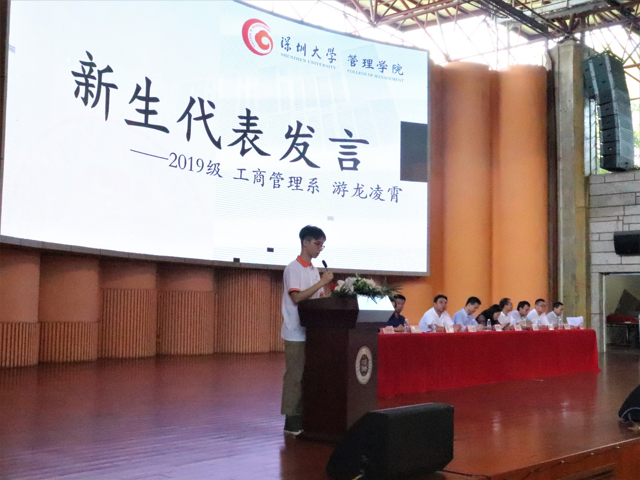 之后,来自工商管理系的游龙凌霄同学以新生的视角看深大,有新奇亦有忐忑,而对于未来的担忧,在步入深大校园时就迎刃而解。游同学号召同学们牢记管院院训,清楚自己的责任,把握各种学习、竞赛机会。不断挑战自我,充实自己的大学生活。