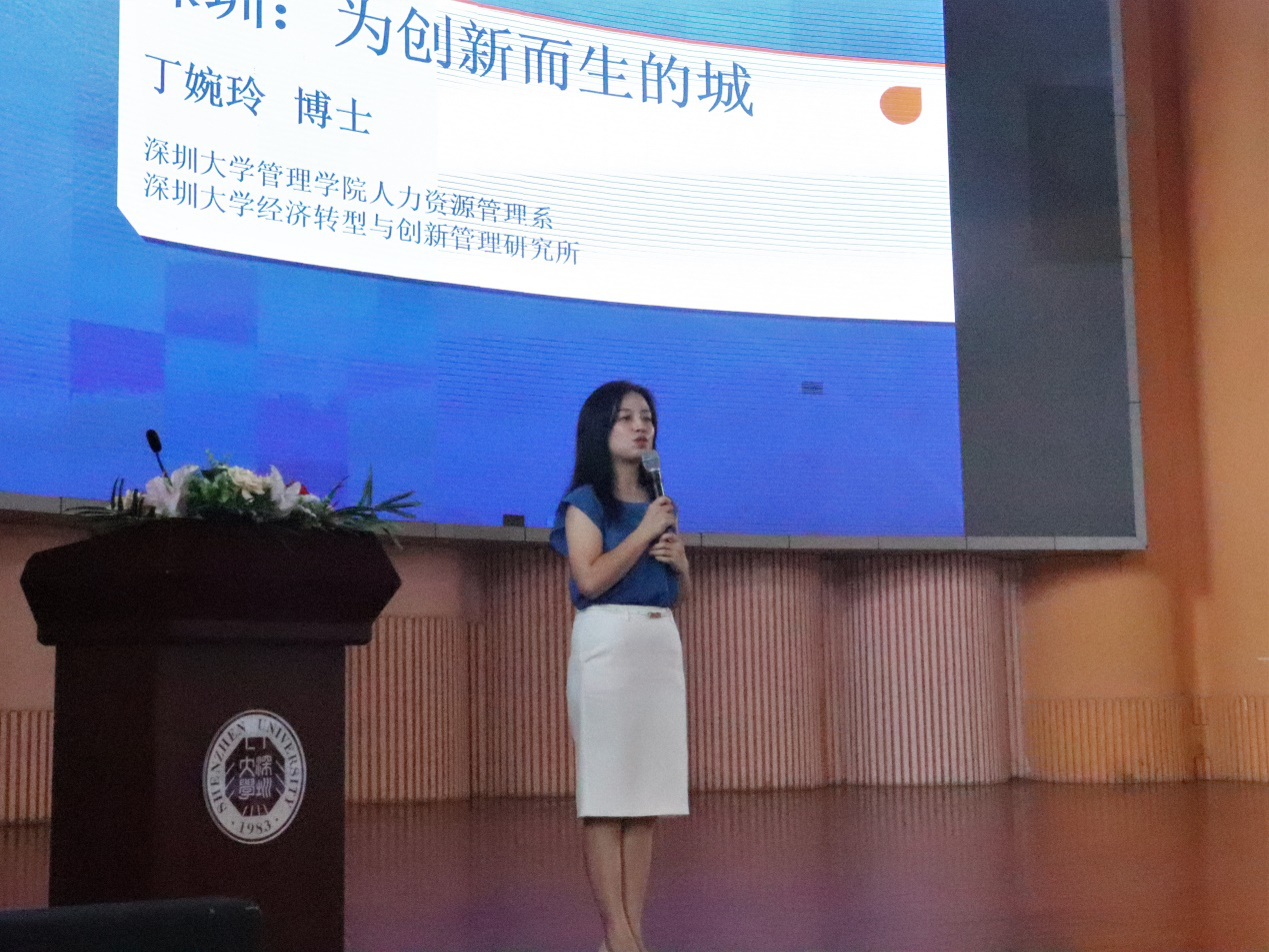 首先,丁婉玲老师以“深圳,为创新而生的城”为主题,打开新生讲座的序幕。丁老师用一系列数据介绍了深圳的历史发展及企业的迅猛发展,而这些离不开深圳的创新发展,其中产业基础、创新政策、移民文化和创业精神是深圳创新发展的重要影响因素。最后,丁老师用“没有梦想,何必深圳”激励同学们付出汗水,收获梦想。
