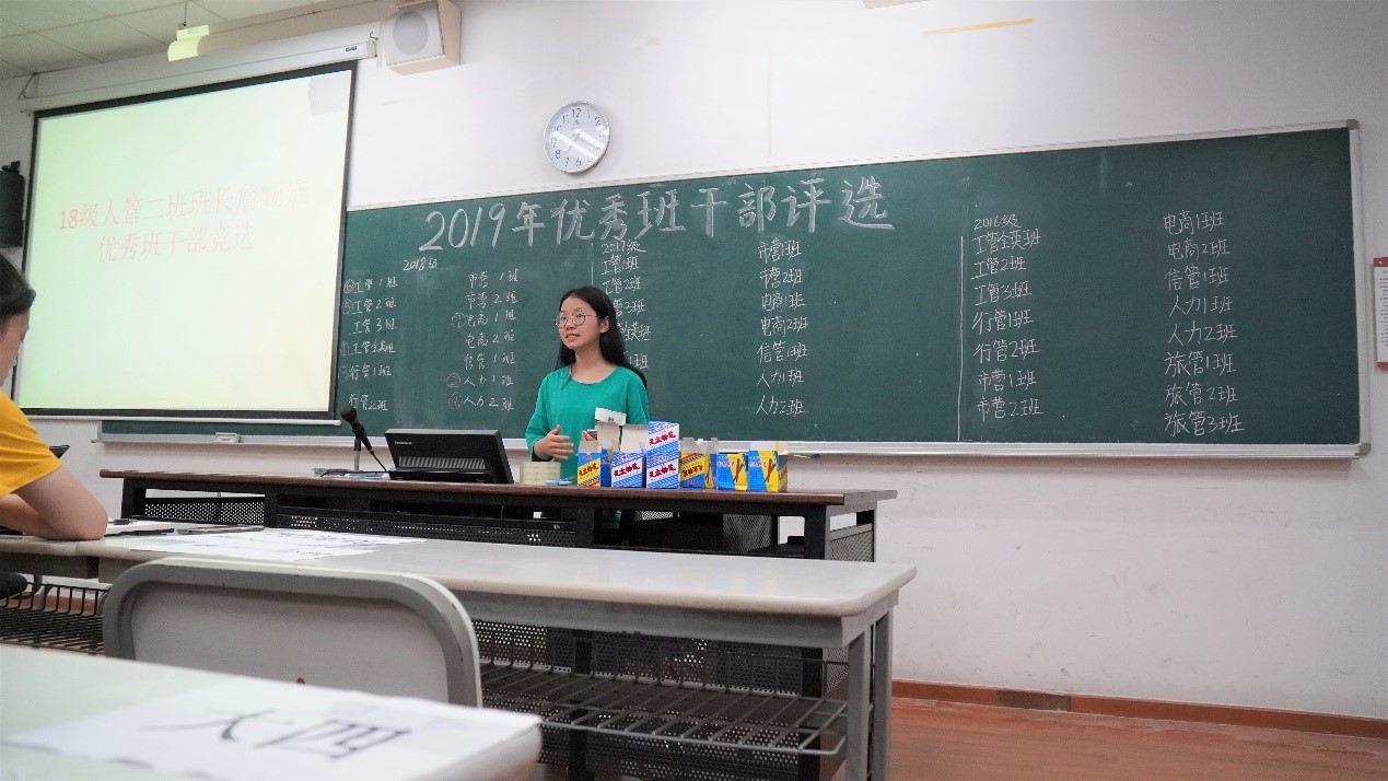 紧接着是17级优秀学生干部竞选人的抽签与演示环节。其中,人力资源管理2班的代表分享了其给班级同学送温暖的故事,然后还对自己过去的一年进行了详细的反思总结。