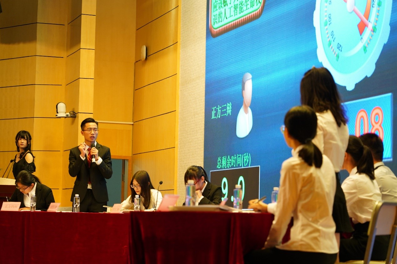 在主席介绍与评委握手后,选手们纷纷入座。待选手们言简意赅地自我介绍后,比赛正式开始。赛场如战场,硝烟瞬时燃起,场上双方辩手你来我往,侃侃而谈。双方选手在立论、驳立论、智辩等各个环节中思路清晰,字字珠玑,使现场气氛迅速升温。如反方提出“人工智能有高超的学习能力”,因此赋予其生命权威胁了人类的前途,而正方以“给予了生命权则意味着被纳入法律体系,要依法行事,无需顾虑”的说法驳论。
