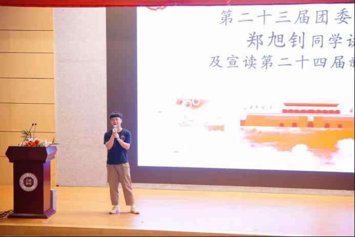 部门视频播放结束后,第二十三届团委副书记郑旭钊同学讲话并宣读第二十四届新团副书记名单。郑旭钊同学总结了过去一年的平凡与不凡,并用自己的工作经历为新一届团委提供了宝贵的经验。讲话完毕,郑旭钊同学宣读第二十四届团委副书记名单,并进行团委书记处的交接仪式。
