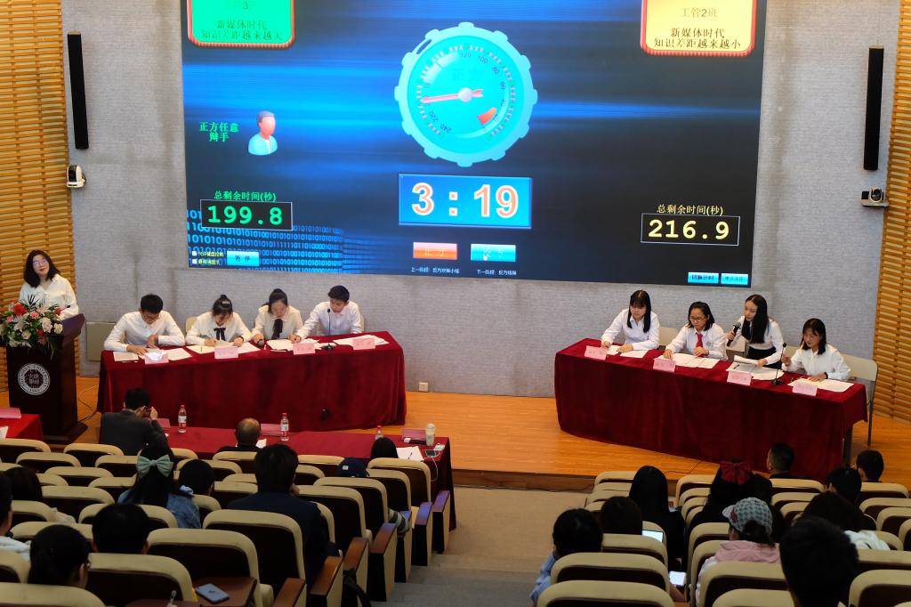 比赛开始过程中,双方队伍唇枪舌战,最终工管二班夺得“新生杯”辩论赛冠军。