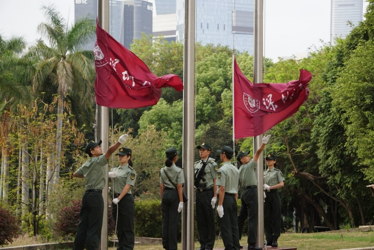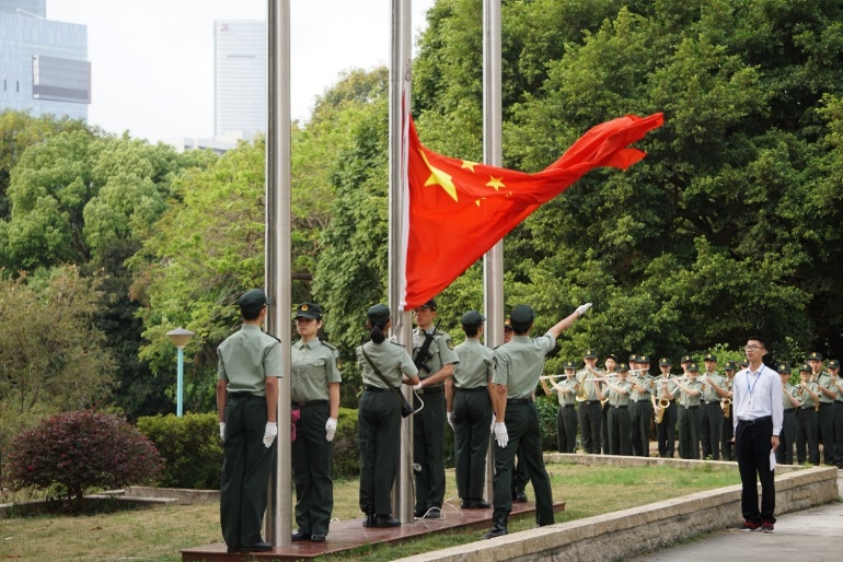 紧接着,在军乐团演奏的《歌唱祖国》中,旗手缓缓地升起了深圳大学的校旗。春风习习,晨曦静谧,全体师生都把自豪和骄傲熔注在国旗和校旗之中。