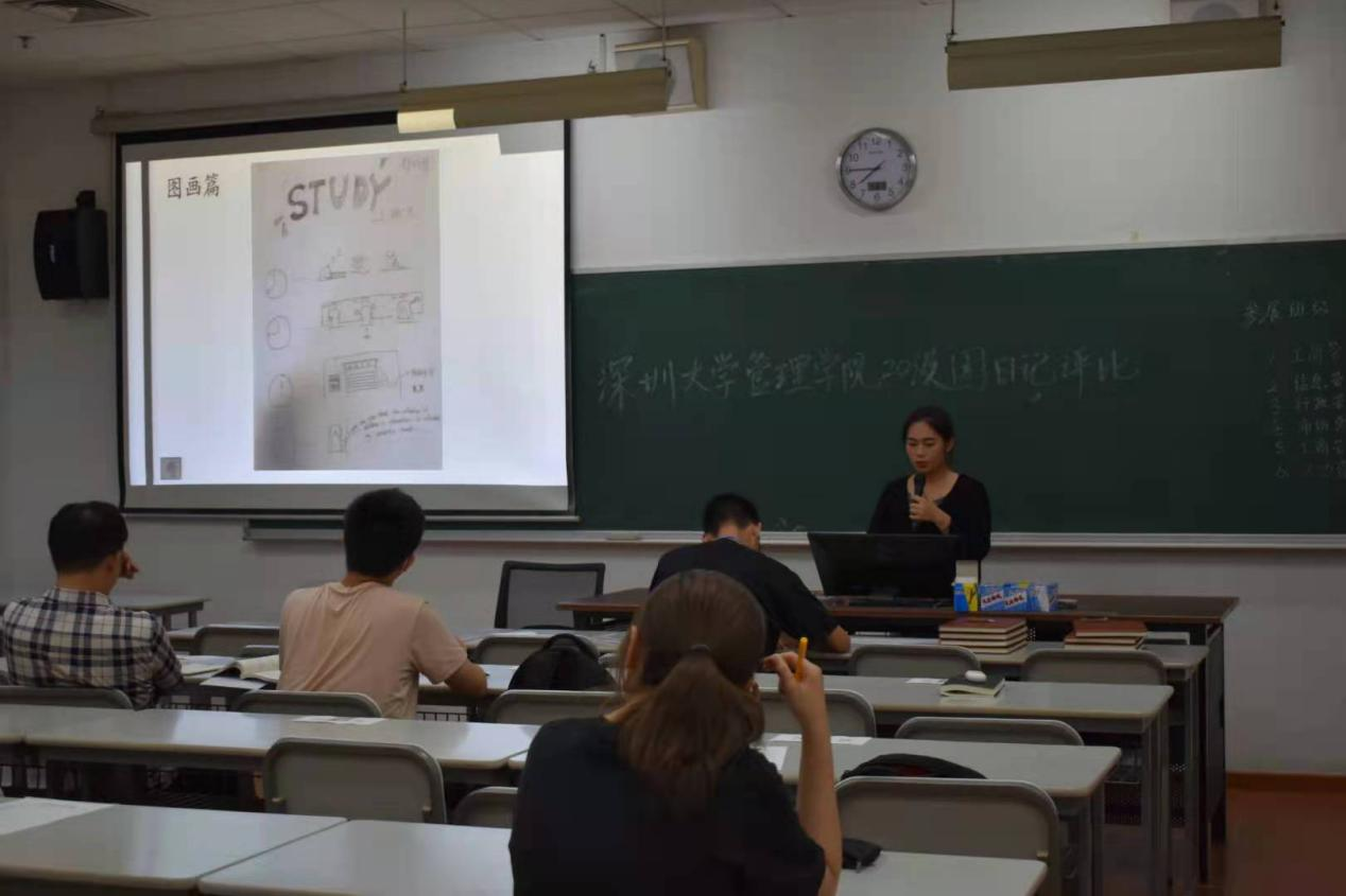 在主持人简短的开场过后,评比活动正式开始,各班级代表依次上台展示。他们把本班同学的优秀创作表展示在PPT里,展现了管院学子的青春活泼和阳光朝气:有精美可爱的贴纸,也有悉心绘制的卡通插图,还有的用散文诗和骈句展现自己的美好憧憬。各班的团日记呈现出高度的凝聚力和组织力,班风班貌积极向上。19级市场营销一班的同学们以手绘的方式进行着温馨而默契的隔空互动,还有的班级同学甚至在团日记中记录了自己创业的故事和心得体会,激励大家勇敢拼搏,不畏艰难险阻。