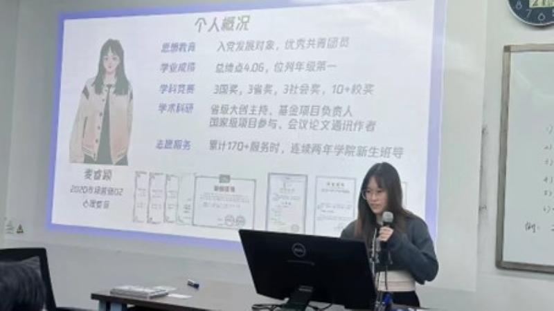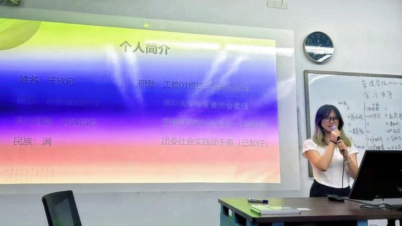 接下来是2021级各班竞选代表的展示环节。其中2021级工商管理1班的于欣可同学分享了她复盘的工作总结,疫情期间感触颇深的零接触派送口罩的经历。此外,她还提出了在任职班长兼任副团支书期间发现的问题和对未来工作的展望,让我们看到了责任与担当。