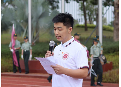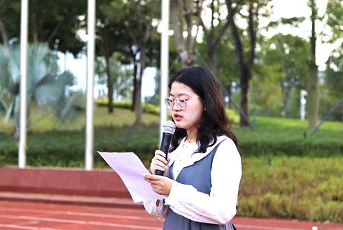 上午7:15分,主持人李章鸿同学宣布升旗仪式正式开始,仪仗队迈着整齐有力的步伐向升旗台行进。伴随着《义勇军进行曲》,五星红旗冉冉升起,全体师生肃立,注视着鲜红的五星红旗并高唱国歌。