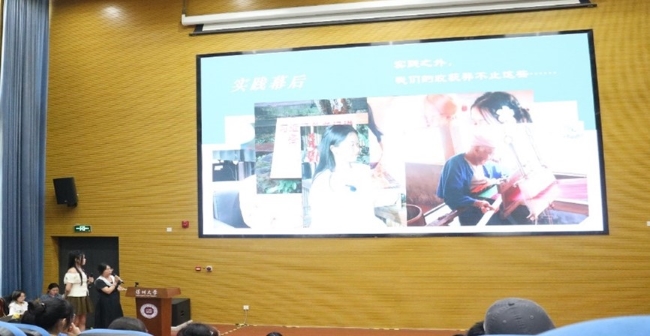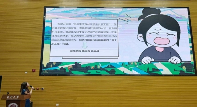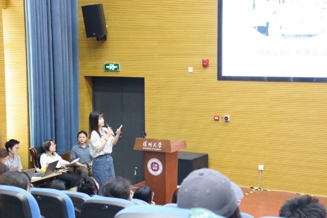 最后,管理学院“小院大成”实践团的代表王梦娇和潘泳瑶同学,以她们在“百千万工程”中的亲身经历为切入点,详细回顾了队伍与当地居民的深入互动以及项目从策划到实施的全过程。这些实践经验不仅为大家提供了一个真实的参考范例,更丰富了在场同学们对“百千万工程”内涵的理解。除了对“百千万工程”的实践经历进行分享,两位同学还对自己参加相关赛事的经验进行了分享,为同学们提供了宝贵的建议。