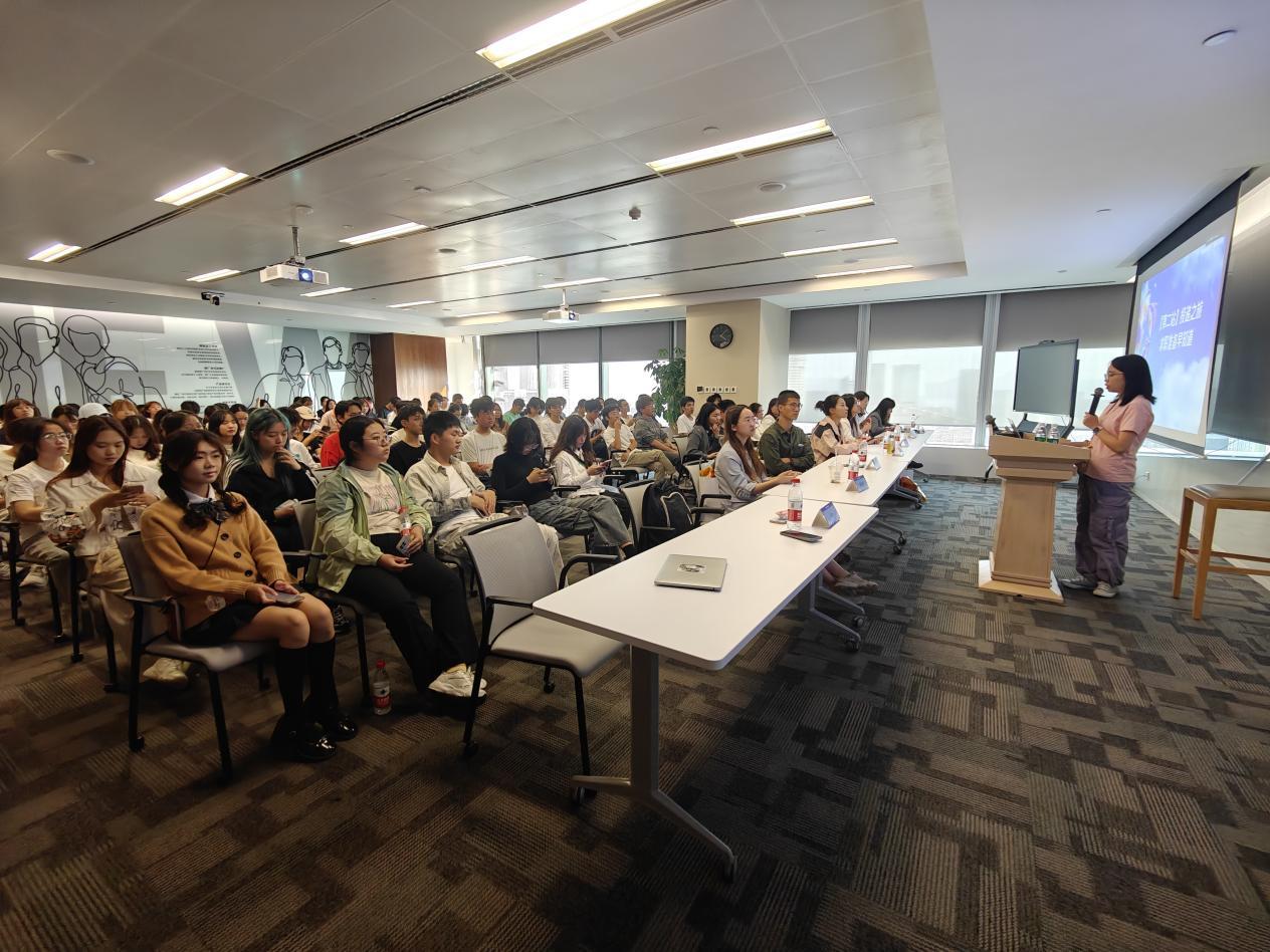随后,同学们来到会议室聆听腾讯HR带来的分享会。腾讯HR深入阐述了公司文化、人才培养体系及员工团队建设等核心议题,除此之外还特别为同学们详细介绍了校园招聘流程及职业发展路径。从腾讯的诞生历程到其在公益领域的诸多贡献,再到公司使命与未来愿景的展望,分享内容既展现了鹅厂强大的科技底蕴,又深刻传达了“正直、进取、协作、创造”的企业价值观。此次宣讲兼具专业性、前沿性与趣味性,让同学们在收获满满知识的同时,也对腾讯与职业规划有了更加全面而深刻的认识。