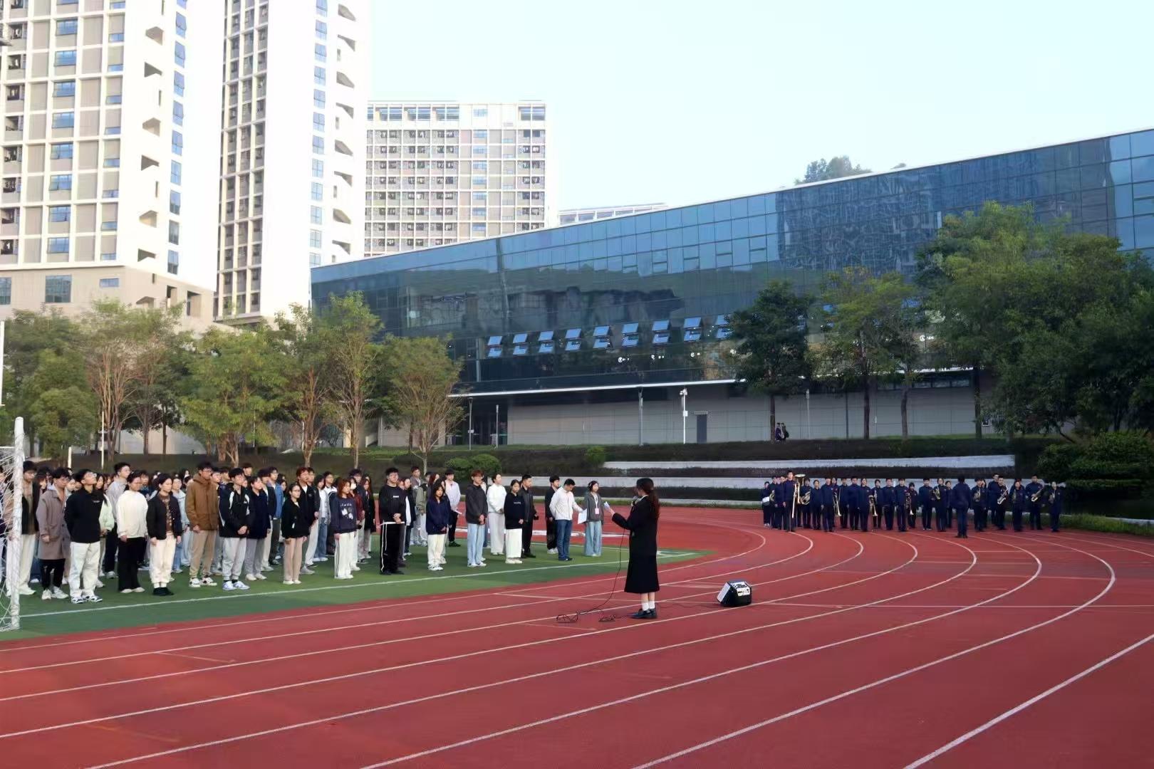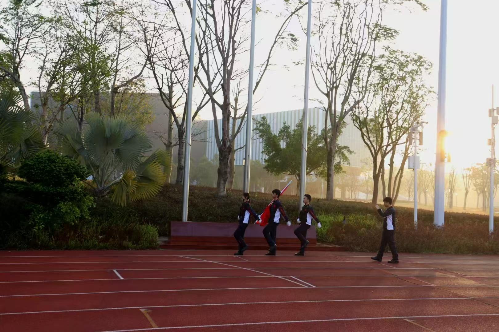 上午7:15分,主持人晏诗淇同学宣布升旗仪式正式开始,仪仗队迈着铿锵有力的步伐向升旗台行进。伴随着《义勇军进行曲》,五星红旗冉冉升起,全体师生肃立,向国旗行注目礼并高唱国歌。