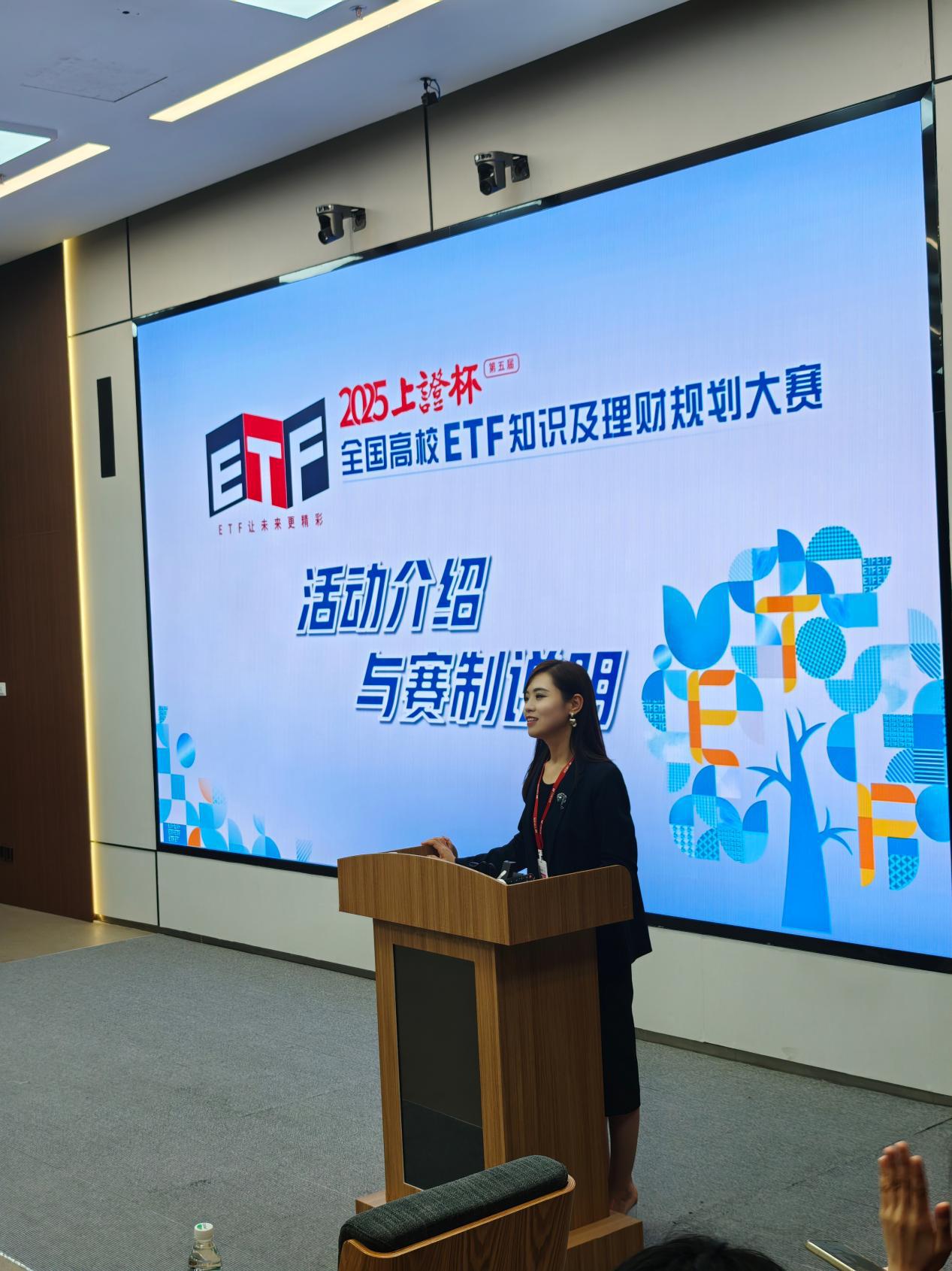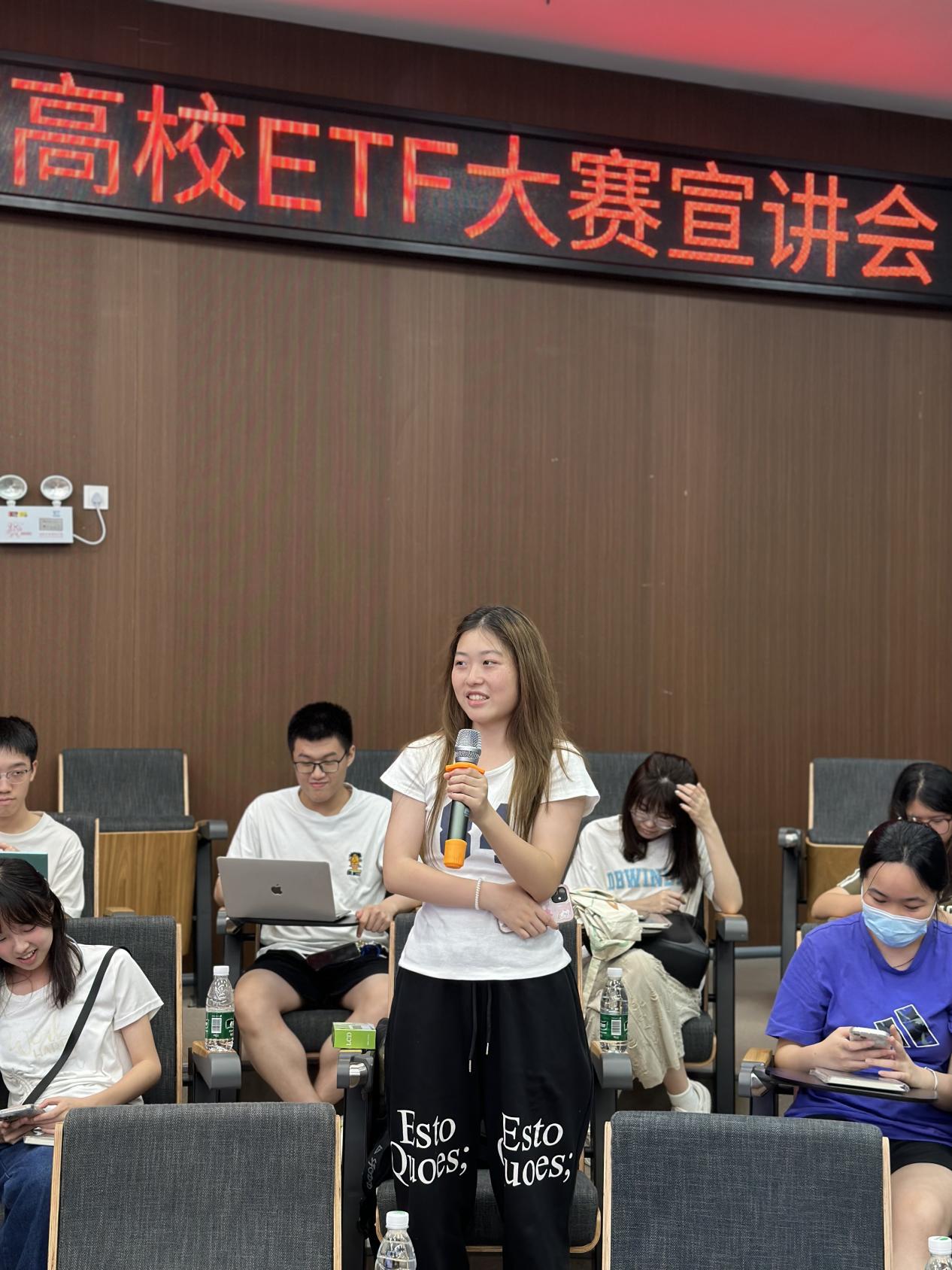 接着,万联证券工作人员袁玮洁就“上证杯”全国高校ETF知识及理财规划大赛进行了全面深入的讲解。她介绍了大赛的主办单位及参赛对象,解析了大赛的具体规则与日程安排。袁玮洁鼓励同学们,ETF大赛是一个宝贵的实践锻炼机会和能力检验平台,希望同学们勇于挑战自己,积极投身于这场知识与胆识的较量中。她的宣讲成功点燃了同学们的热情,收到了同学们的热烈反响。