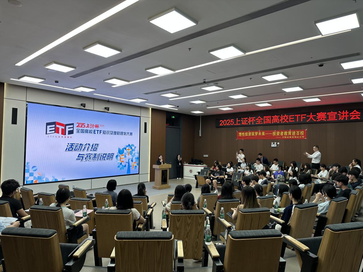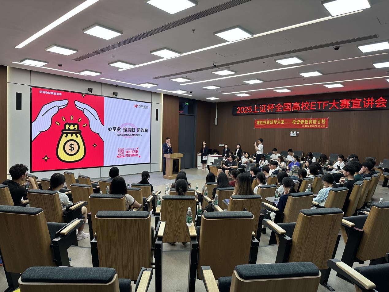 为增强大学生金融风险意识,培养理性消费和财务规划能力,提升金融素养,同时鼓励并指导同学们参加2025"上证杯"全国高校ETF大赛,管理学院团委联合万联证券深圳分公司于2025年5月15日晚在丽湖校区明理楼B104举行了防范非法金融活动知识宣传暨2025"上证杯"全国高校ETF大赛宣讲。