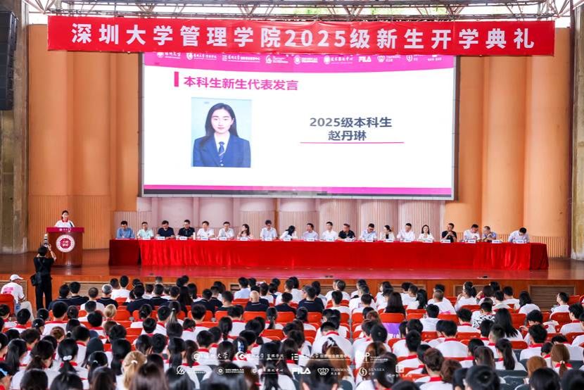 紧接着,2025级本科生赵丹琳同学作为新生代表发表了演讲。她首先提及自己选择就读电子商务专业的契机源于深圳蓬勃发展的跨境电商产业、深大卓越的教学质量与浓厚的创新创业氛围和父亲作为深大管院毕业生的言传身教。借用彼得・德鲁克和乔布斯的名言,她向在座新生畅谈自己对大学生活的规划:在大一探索尝试加入学生组织、参加学术竞赛、投身志愿服务等活动,计划学习舞蹈、唱歌等新技能,在大二至大四则按深大规划矩阵图明确目标、积累实践。最后,她结合对村上春树的小说《小城与不确定的墙》的读书感悟,向新生强调行动的重要性,呼吁同学们珍惜资源、把握机会,以 “Stay hungry, stay foolish” 的姿态迎接未来。