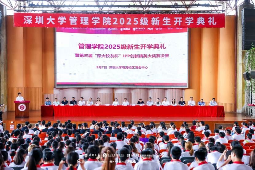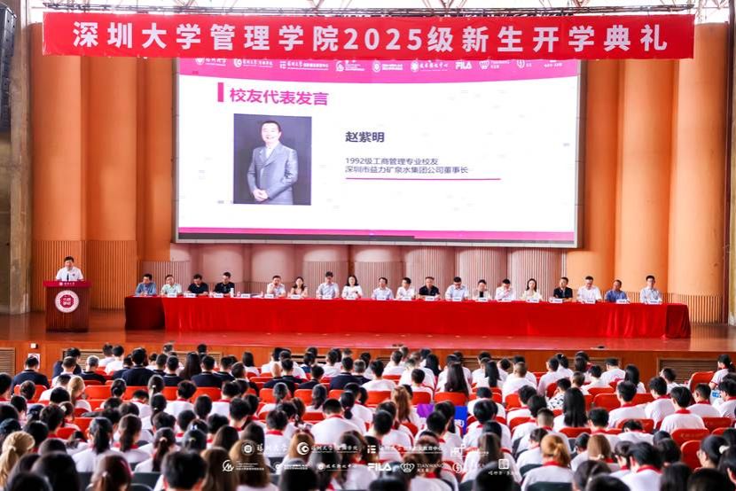 随后,管理学院1992级工商管理专业的赵紫明作为校友代表发言。他回顾了自己受邓公南巡影响,怀揣创业梦想考入深大管院的经历,强调管院四年学习中“脚踏实地、自立、自律、自强”的校训为其克服创业的困难与投身快消行业的挑战提供了精神力量。他的女儿赵丹琳如今也如愿进入深大学府,接续深大基因。最后,赵紫明校友礼赞“校友杯”决赛团队,致敬学院与捐资校友,寄语25级新生们在机遇与挑战并存的时代脚踏实地、探索创新,并在教师节前夕向老师们送上祝福。