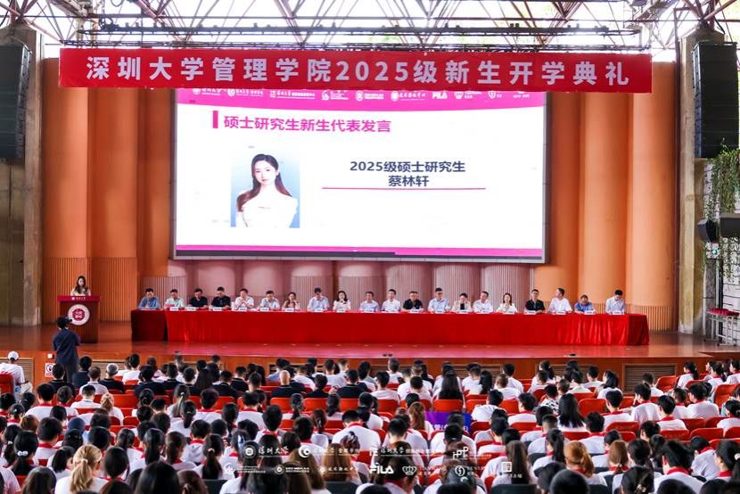 随后,2025级硕士研究生蔡林轩作为研究生新生代表发言。从本科就读、毕业,到任教职工,现再以研究生身份重返管院,她向新生提到自己选择读研是为精进专业、沉淀自我与探索方向。接着,她结合本科时受“红马甲”志愿服务与班导班助帮扶的相关经历,向新生讲述她投身相关工作的契机,并借校友活力特质及搬迁丽湖校区培养的适应力向新生们阐述深大创新、务实的底色。她表示,研究生是一个深化人生探索的阶段,呼吁新生以“创新、利他、阳光”三种文化拓展边界、构建共同体、传递正向力量,携手在深大脚踏实地、仰望星空,书写成长答卷。
