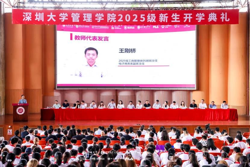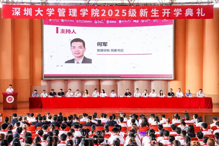 2025年9月7日上午,深圳大学管理学院在粤海校区演会中心隆重举行2025级新生开学典礼。出席本次典礼的嘉宾有管理学院院长张卫国、管理学院副院长蒋建武、牛奔、于素敏、陈星宇,学院党委书记何军、管理学院党委副书记腾飞、党委委员丁婉玲、冯元粤、工商管理系副系主任程雨桥、人力资源管理系主任苏方国、市场营销系主任刘世雄、电子商务系主任马利军、电子商务系副系主任王刚桥以及一百十余位杰出校友代表,新生班主任、辅导员和管理学院2025级全体新生共同参加了本次典礼。典礼由管理学院党委书记何军主持。
