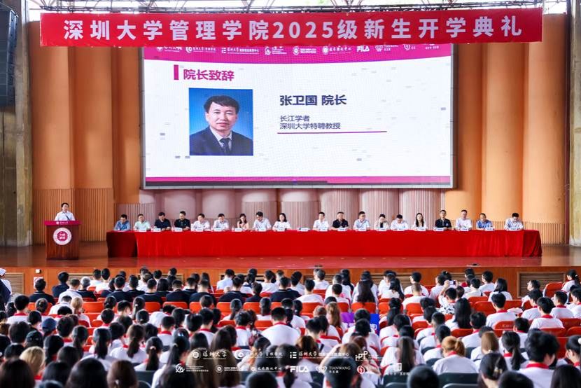 接下来,张卫国院长代表管理学院发表讲话。他首先向 2025 级新生致以衷心祝贺,欢迎他们来到管理学院。随后,他为新生们详细讲述了深圳大学建校42年发展成果,包括深圳大学的办学特色、顶尖师资、全球排名及学科实力,并详细介绍了管理学院的学科排名情况、雄厚的师资力量与完备的人才培养方案。对此,他向新生提出四点期望:担当时代责任、锤炼道德修养、勤奋好学思辨、积极乐观向上,并鼓励新生要心怀理想、砥砺前行,成长为有社会责任感的优秀人才。