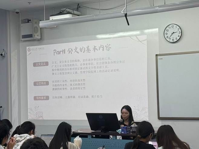接着是宣讲环节,首先由学创事务部部长张曼同学对公文通与院网文案的撰写规范性要求展开宣讲。张曼同学先就公文的基本认知、内容编排、图片编排及文档格式等要点向干事们进行简要介绍,帮助大家全面系统地了解公文通的文体特性与写作标准。接着,张曼同学围绕公文写作的规范性和时效性两大核心,将公文的行文结构作为讲解脉络,为干事们详细讲解了公文写作的具体方法与实操要求。最后,她着重强调了公文语言正式、简要的特点,并简略总结了撰写公文的技巧要点。张曼同学对于公文的详细讲解,让干事们对公文通的规范要求与相关流程有了全面且深入的了解,为日后开展公文写作工作打下知识基础。