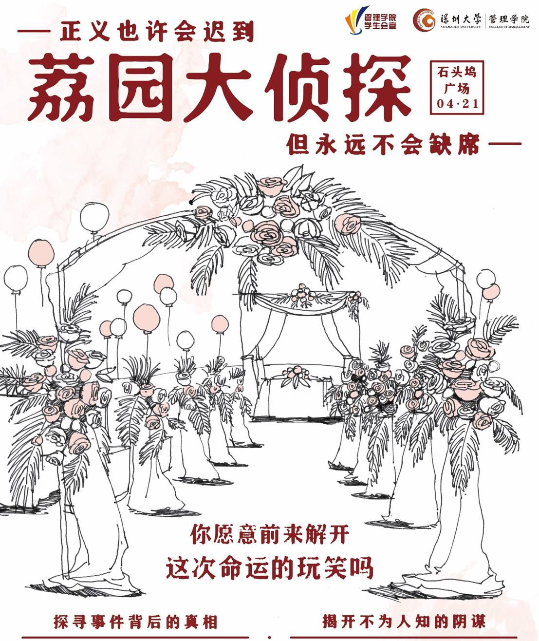 2019年4月21日,管理学院学生会办公室与学生事务部合办的“荔园大侦探——白色的婚纱”在石头坞广场正式开始。