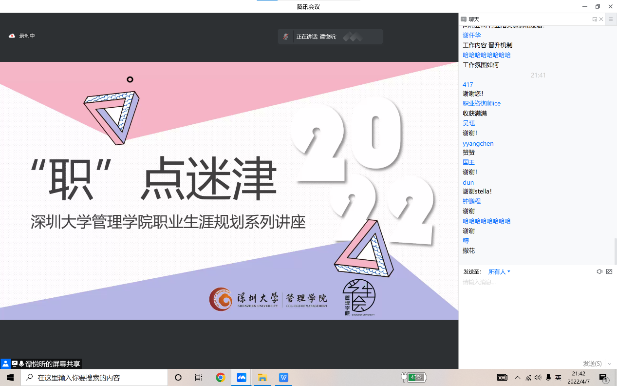 清风草木新,花开又逢君。在最美的人间四月天,深圳大学管理学院学生会于2022年4月7日成功举办了“‘职’点迷津”——职业生涯规划系列讲座。由于疫情肆虐,本次讲座采用线上方式进行,尽管有距离上相隔,但大家依然热情参与。