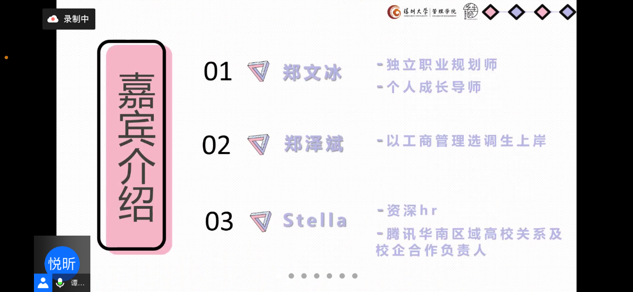 2015届管理学院校友、独立职业规划师郑文冰学姐;2017届深大校友、以工商管理选调生上岸的郑泽斌学长;毕业于南开大学、现担任腾讯华南区域高校关系及校企合作负责人的Stella女士,应邀作为本次讲座的主讲人,为同学们传授职业生涯规划经验。