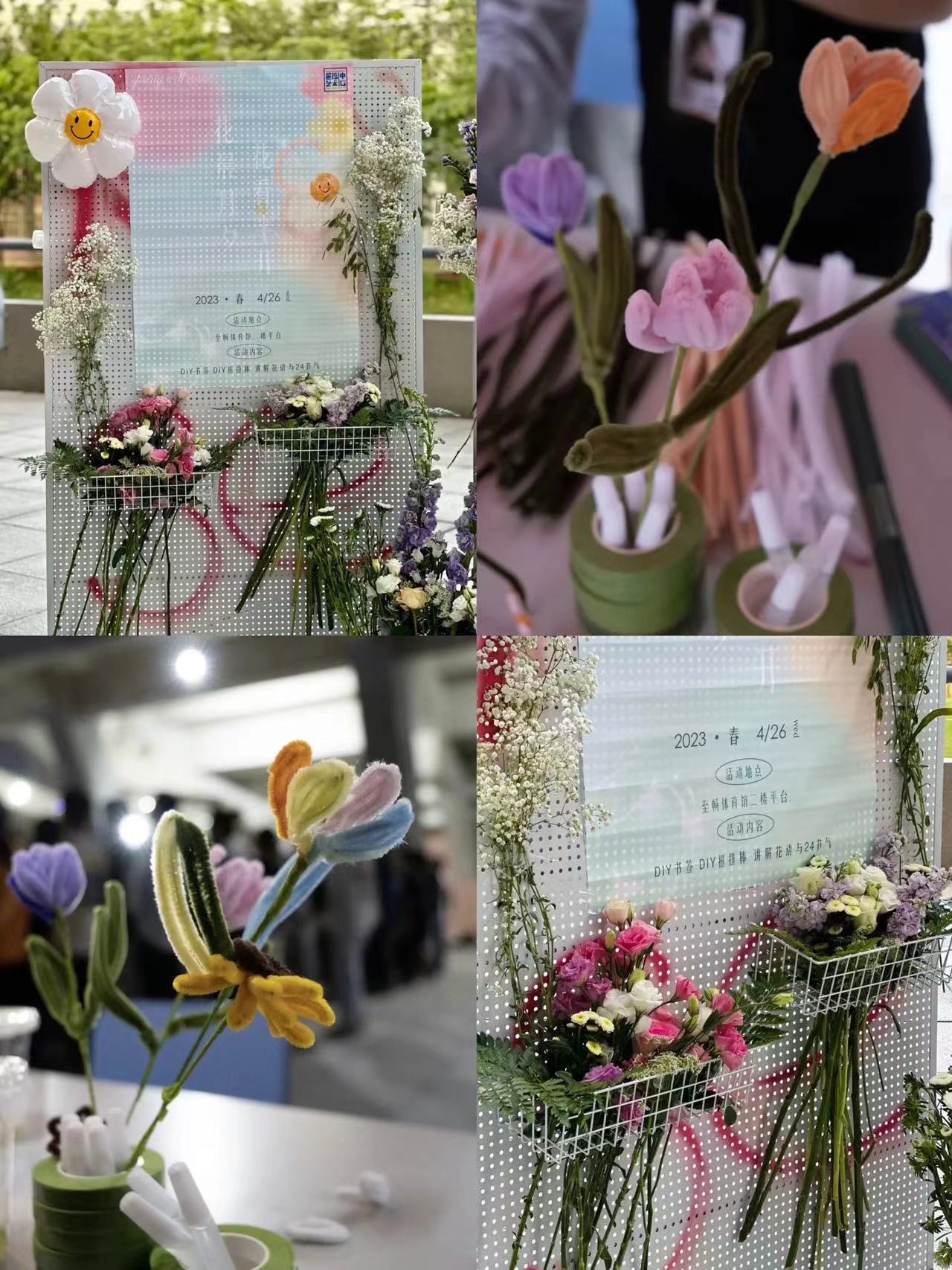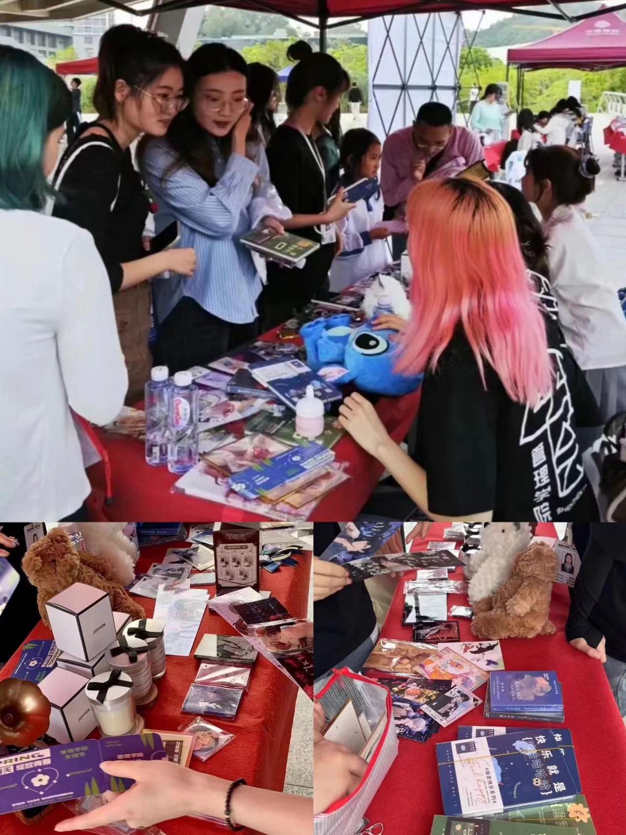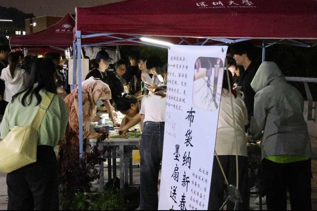 4月26日晚上六点,同学们陆陆续续的来到了现场,驻足与自己感兴趣的摊位前。一时间宽敞的平台顿时挤满了人,热闹非凡。“衣笔点睛”“花晨月夕”“布袋纳新春 墨扇送四方”此类手工艺摊位点燃了同学们创作的灵感,墨笔在白衣和纸扇上勾勒出春天的线条,鲜花书签和扭扭花留存住春天的色彩。新媒体运营部准备的禁止焦“绿”主题展板和情绪分享站前站满了密密麻麻的人群,同学们设计了属于自己的笑脸,将包含今日心情的小纸条投进纸箱,在套圈小游戏中甩开所有的负面情绪,全身心地投入到快乐的游戏中去。他们每套中一个圈,就会发出一声兴奋的欢呼,就连路过的人都会被场地上欢乐的气氛所感染,加入到这场盛大的活动中去。