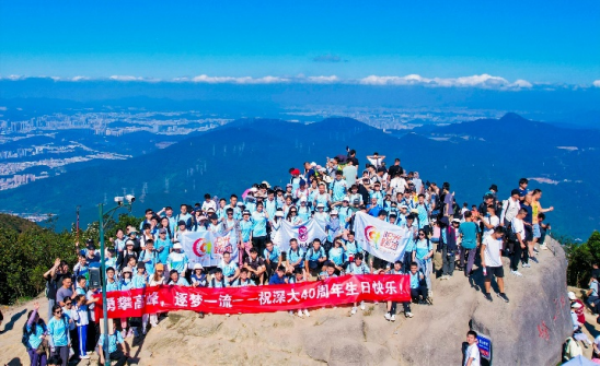 中午14:00,登顶大部队陆陆续续抵达梧桐山山顶,130名登顶师生站在鹏城之巅齐声呼喊口号为深圳大学四十周年送上诚挚的祝福:“勇攀高峰,筑梦一流,祝深圳大学四十周年生日快乐!”