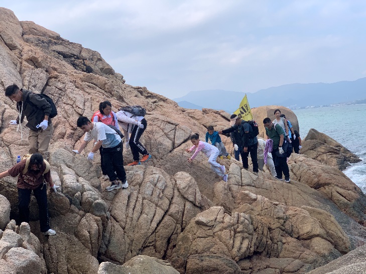 本次徒步路线起于桔钓沙七星湾集结点,终于桔钓沙沙滩汇集点,全程5 km 。我院院师生、校友由山路步入礁石,一路挑战由礁石组成的海岸线,全体成员在徒步中携手共进,互相帮助鼓励。