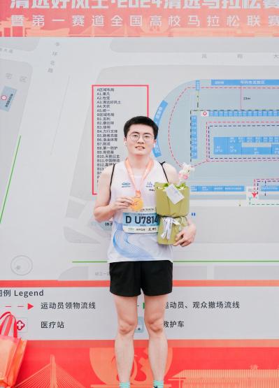 首次参赛的阳光跑团23级临床医学专业的汪昊同学带伤参赛,仍以1小时17分17秒的优异表现,夺得深大半程马拉松21.095公里组参赛组成员第1名、高校组第5名,荣获2024年清远半程马拉松男子组第18名。