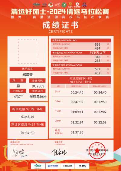 经济学院郑泽豪同学净时成绩1小时37分30秒位于半程马拉松21.095公里组全国第452名。